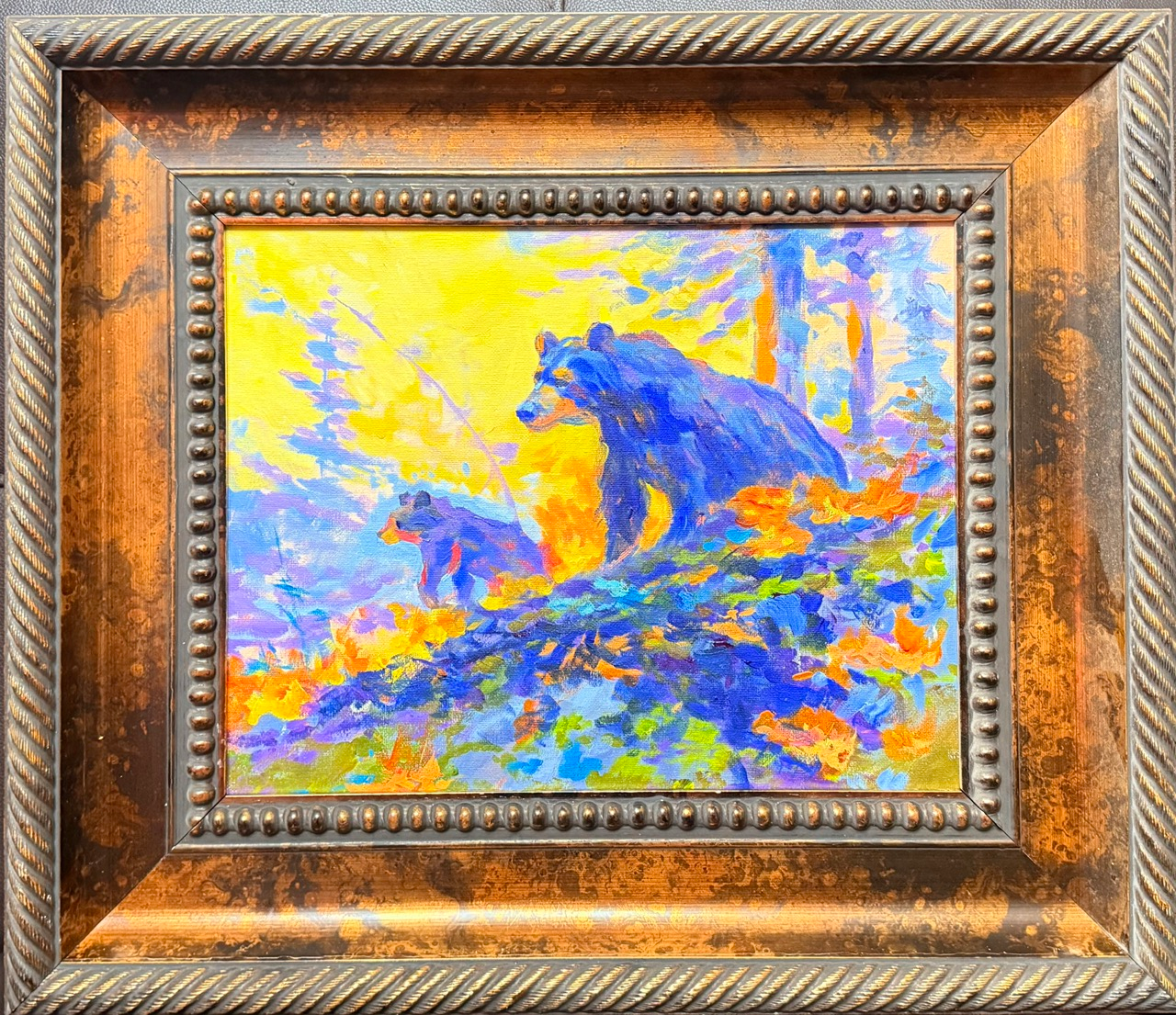 This painting was inspired by the 2021 Caldor Fire in California. I remember the red sky and the heavy smoke spreading through the mountains, a scene that felt both powerful and heartbreaking. On the news, I saw bears running into Lake Tahoe city, escaping the flames as the fire moved closer to the lake. That image stayed with me — a moment of chaos, beauty, and the raw struggle of nature trying to survive.