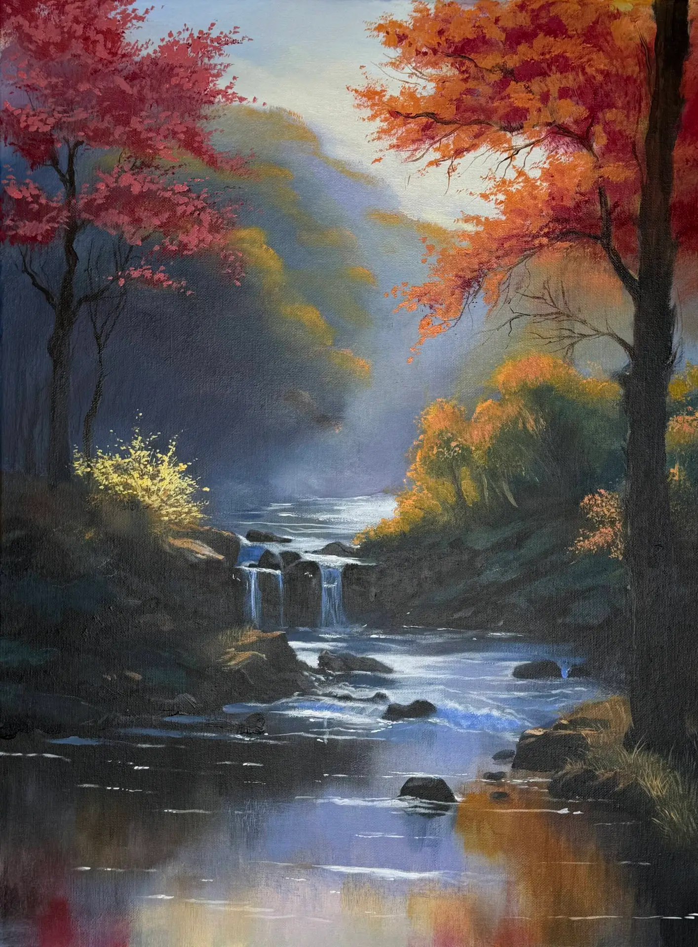 “When I sat down to paint ‘The Living Way,’ what I really felt was this deep sense of calm and guidance, like finding a peaceful path in the midst of everything. For me, those glowing autumn trees and the misty light in the distance are like a promise, a gentle reminder that even when things feel uncertain, there’s always a beautiful, living way forward. And the way the water just keeps flowing, always moving but also reflecting everything so clearly – it’s like a metaphor for life itself. I hope it gives you that same feeling of peace and reassurance, like you’ve found a special, quiet place just for you.”